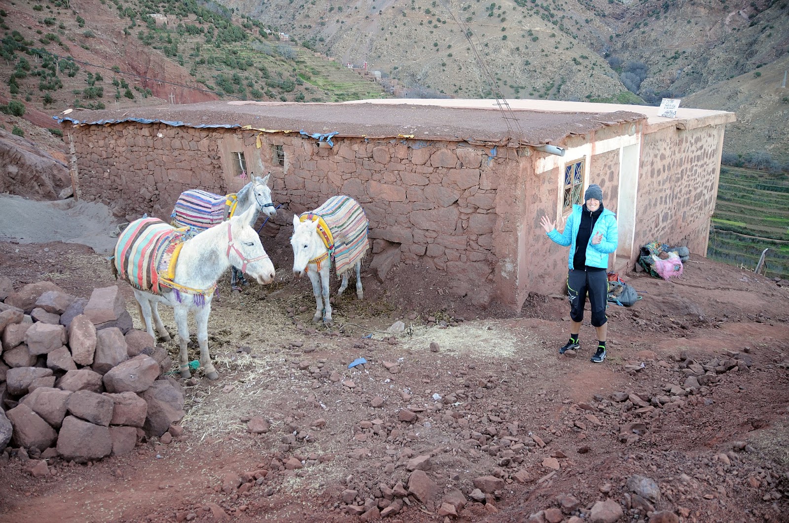 Efter en timme med bil nådde vi startplatsen för vår vandring, som låg en knapp mil utanför staden Imlil. Där väntade redan Hassan och hans mula, som hette något i stil med Dechanel, på oss. Mulorna (mamma häst, pappa åsna) är starka och säkra i bergen och kan bära 150-200 kilo på ryggen. De kan börja arbeta i femårsåldern och sköter man dem väl kan de fortsätta i uppåt tjugo år!
